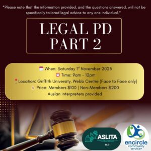 ASLITAQ is excited to be partnering with Pine Rivers Community Legal Services part 2 in order to provide a role-play PD where CPDIs, CPIs and CIs can practice interpreting in legal settings. This role-play workshop will help interpreters to unpack legal jargon for scenarios involving Wills and EPOAs. The Advance Health Directive (AHD) document will be available too so that participants can ask our wonderful presenters questions. Looking forward to seeing you all there!