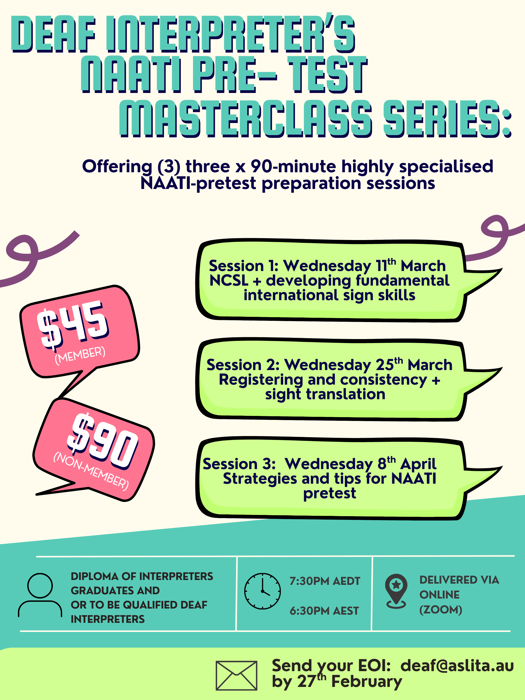 Don’t miss this opportunity to prepare for your upcoming NAATI exam! We will cover many key components of the exam, including the NCSL, understanding International Sign skills and their foundations, sight translations, as well as practical strategies and tips for sitting the exam.