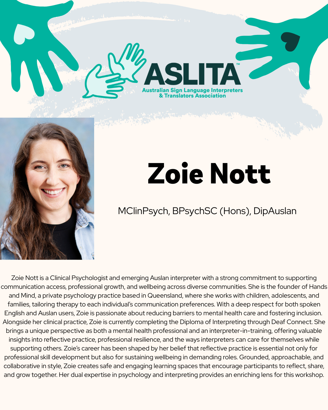 In this workshop, Zoie explores how interpreters can sustain their wellbeing while delivering high-quality work. This interactive 45-minute session introduces the concept of reflective practice, why it matters, and how it can be used before, during, and after assignments to strengthen both professional skills and personal resilience. Participants will learn practical strategies for reflection, see a simple reflective conversation in action, and take away self-care tips tailored to the unique demands of interpreting.
