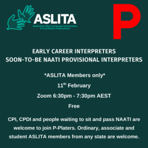 P-Platers is a social group for early career interpreters and soon-to-be NAATI certified provisional interpreters. This is a group for ASLITA members (including associate members) from any ASLITA state Association who: